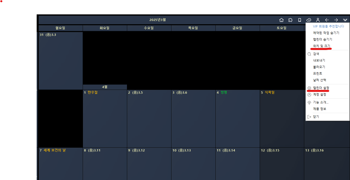 - 캘린더 설정: 캘린더 설정에서는 달력의 투명도 및 셀 간격, 크기, 글씨 크기, 색깔 등 자신이 원하는 달력으로 커스튬을 할 수 있습니다.
