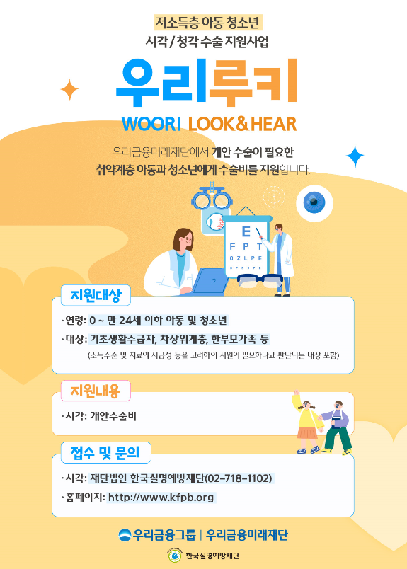 한국실명예방재단에서 좋은 취지로 진행하고있는 사업이니 지원대상에 해당되시는 분들은 지원을 받아보시기 바랍니다. 신청기한과 재원 소진시 조기 마감이 된다고 하니 해당되시는 분들은 서두르세요!!