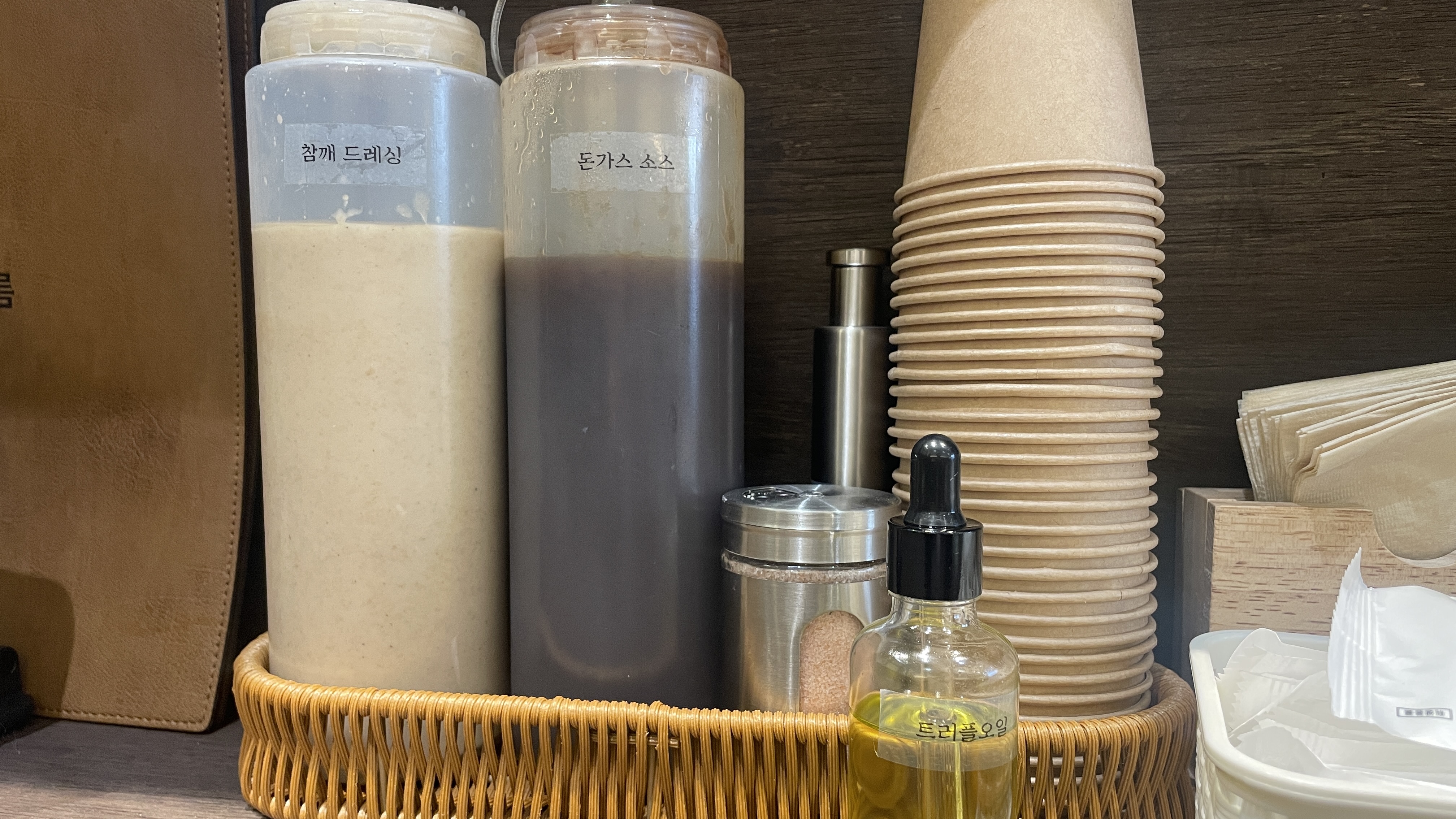 참깨 드레싱, 돈가스 소스, 히말라야 솔트, 통후추, 트러플 오일까지 준비되어 있습니다.