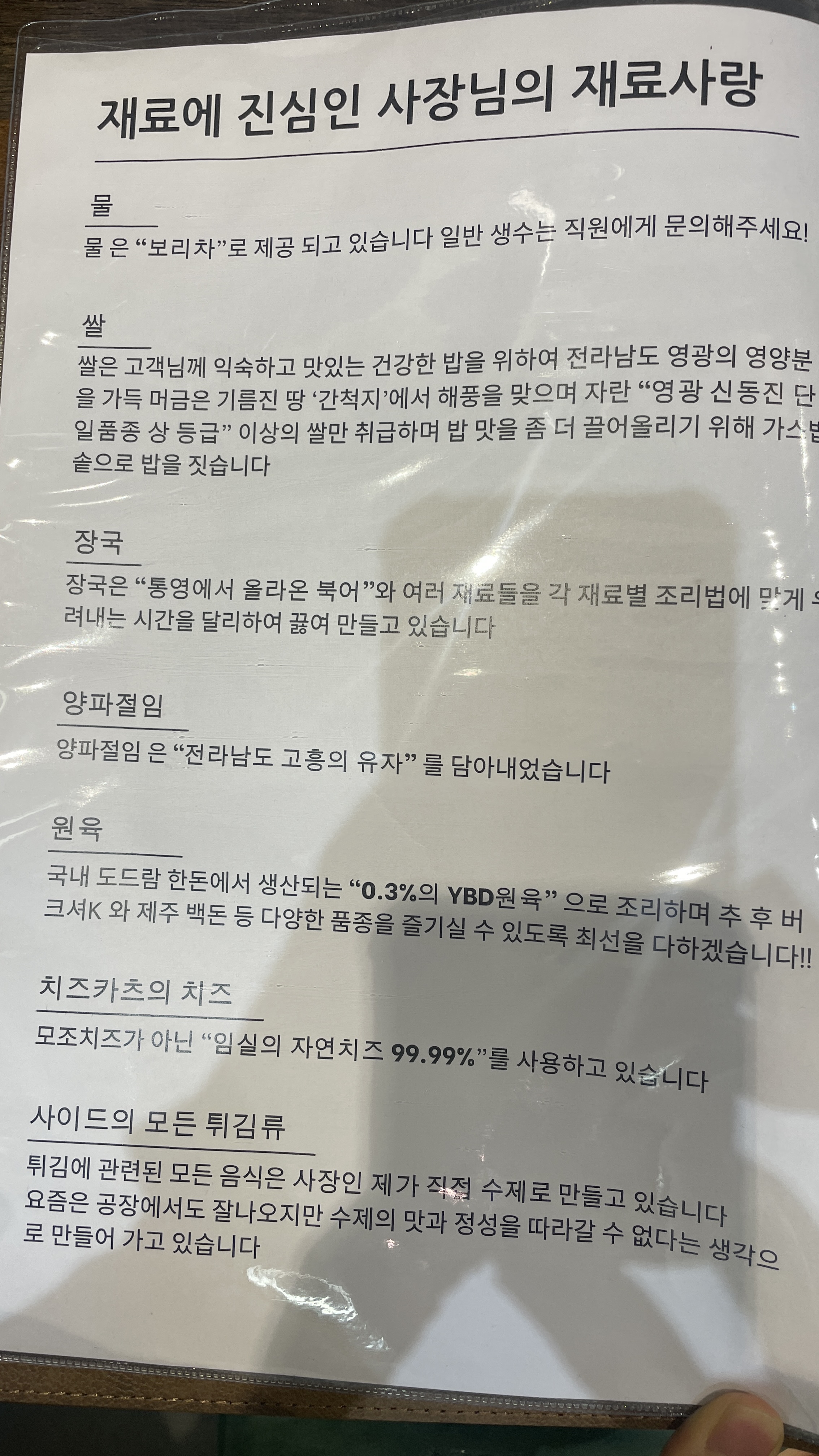 사장님의 음식에 대한 진심이 느껴지는 곳입니다. 메뉴를 찬찬히 살펴보시기를 추천드려요. 특히 메뉴판 뒷면을 보면 요리에 사용하는 재료 하나하나에 대한 소개를 할 만큼 좋은 재료를 사용하는 마음과 맛 좋은 음식을 위한 사장님의 진심이 느껴지는 곳이에요.
