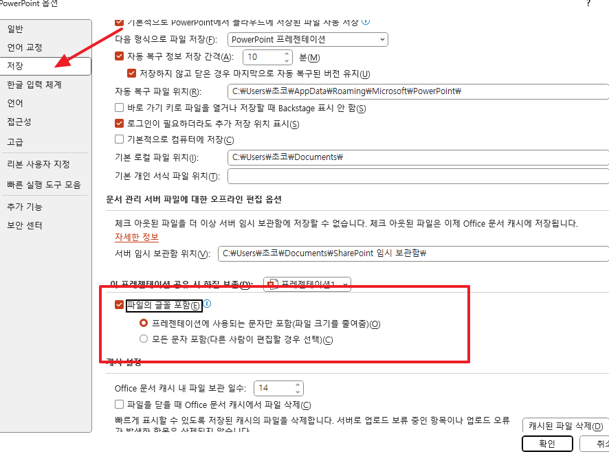 파일 - 옵션 - 저장 - 파일의 글꼴 포함 에서 아래와 같이 체크