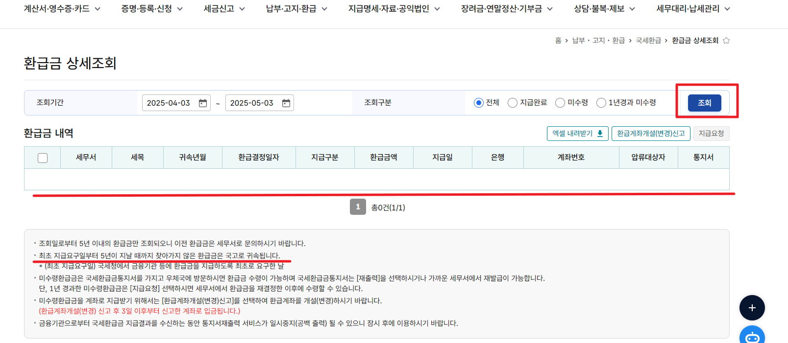 상단의 납부 고지 환급 클릭! - 국세 환급 클릭! - 환급금 상세조회 클릭!