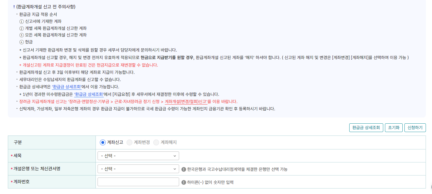 계좌 신고 및 변경 해지가 가능합니다. 이곳에 계좌를 신고하면 환급금이 신고 계좌로 이제가 되며 현금으로 받기를 원하시면 이곳에 등록한 계좌를 해지하셔야 합니다.