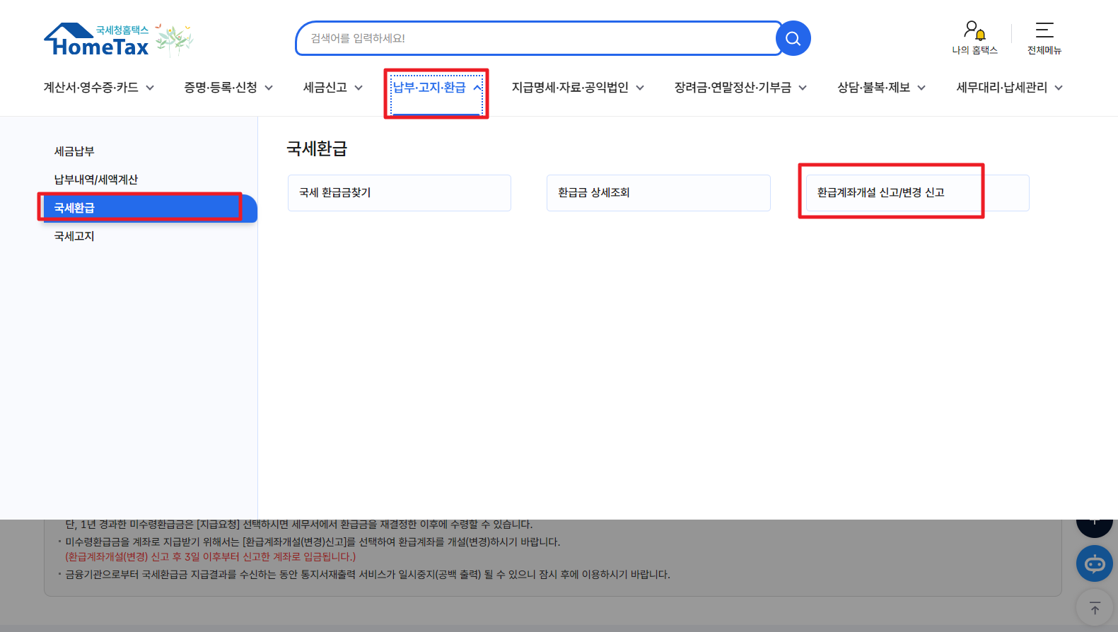홈택스 - 국세환급 - 환급계좌 개설 신고/변경 신고 클릭