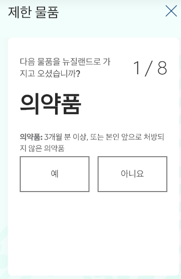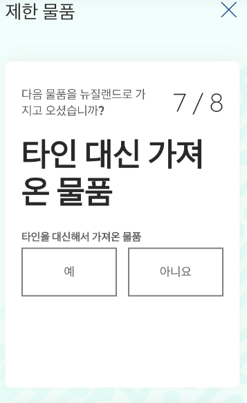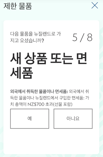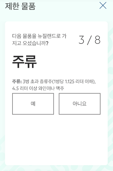 여기서 주의점은 담배 항목입니다.!! 뉴질랜드는 1인당 50개피 이상의 담배를 가져올 수 없다는 점!!!