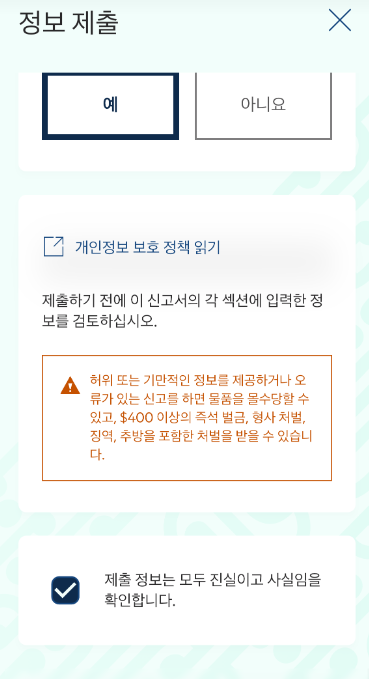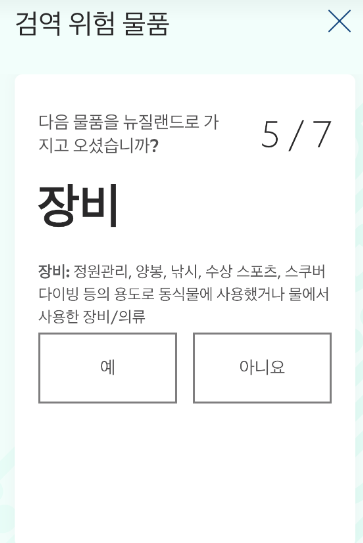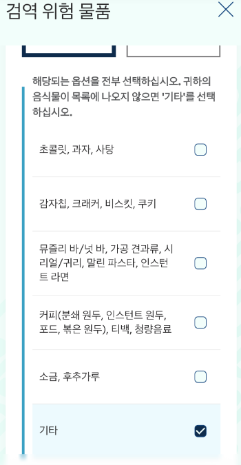: 이 섹션이 중요합니다. 자신이 가져올 물품에 대해 솔직하게 작성하는 것이 좋습니다. 괜히 거짓 작성할려다 입국장에서 벌금을 물을 수 있으니.!!! 그냥 솔직하게 작성하기!!!