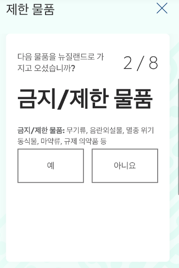 여기서 주의점은 담배 항목입니다.!!  뉴질랜드는 1인당 50개피 이상의 담배를 가져올 수 없다는 점!!!