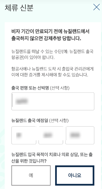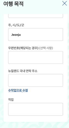 - 뉴질랜드 국내 연락 주소: 자신의 숙소 주소 입력!( 구글에서 검색해서 영문 주소 복붙)