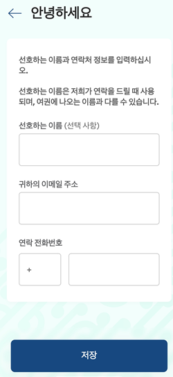 - 선호하는 이름: 실명으로 해도 좋고 닉네임으로 해도 상관없음. - 귀하의 이메일 주소: 지메일을 추천드림 - 연락 전화 번호: +82 입력 10******** (첫자리 0을 제외한 자신의 휴대전화 번호 입력) |