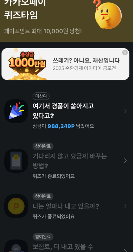 - 카카오톡 앱에서 '카카오페이' 서비스를 선택하거나, 퀴즈 관련 알림 메시지를 통해 접근할 수 있습니다.