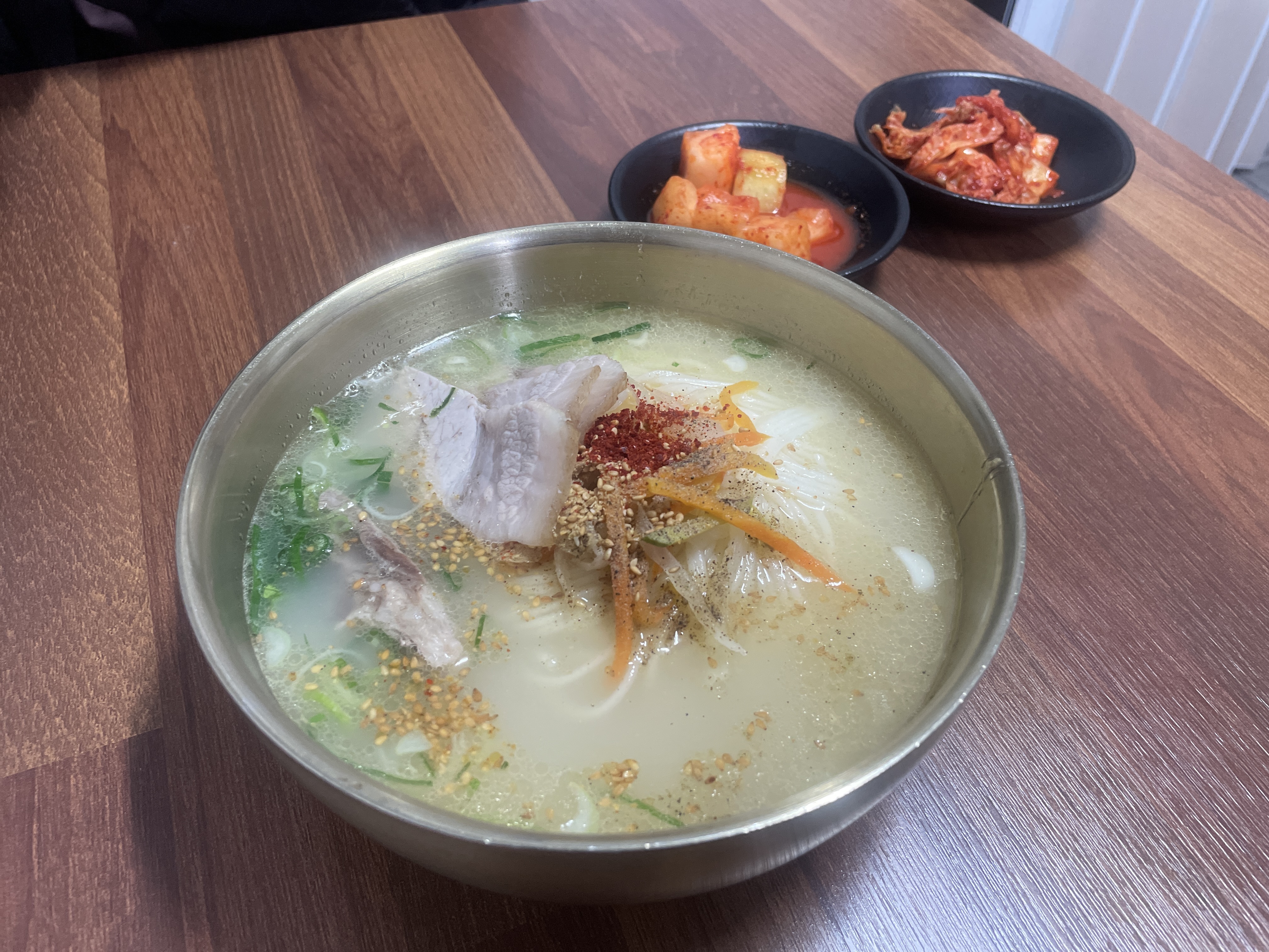 고기 국수의 국물이 정말 뽀얍니다. 진한 육수 베이스에 쫄깃한 면의 식감이 기가 막힙니다. 고기는 퍽퍽하지 않고, 촉촉하며 쫄깃한 식감이 일품.!!1 씹을수록 단맛이 퍼집니다. 고기 국수와 함께 아삭아삭한 깍두기와 김치는 그 맛을 더해줍니다.