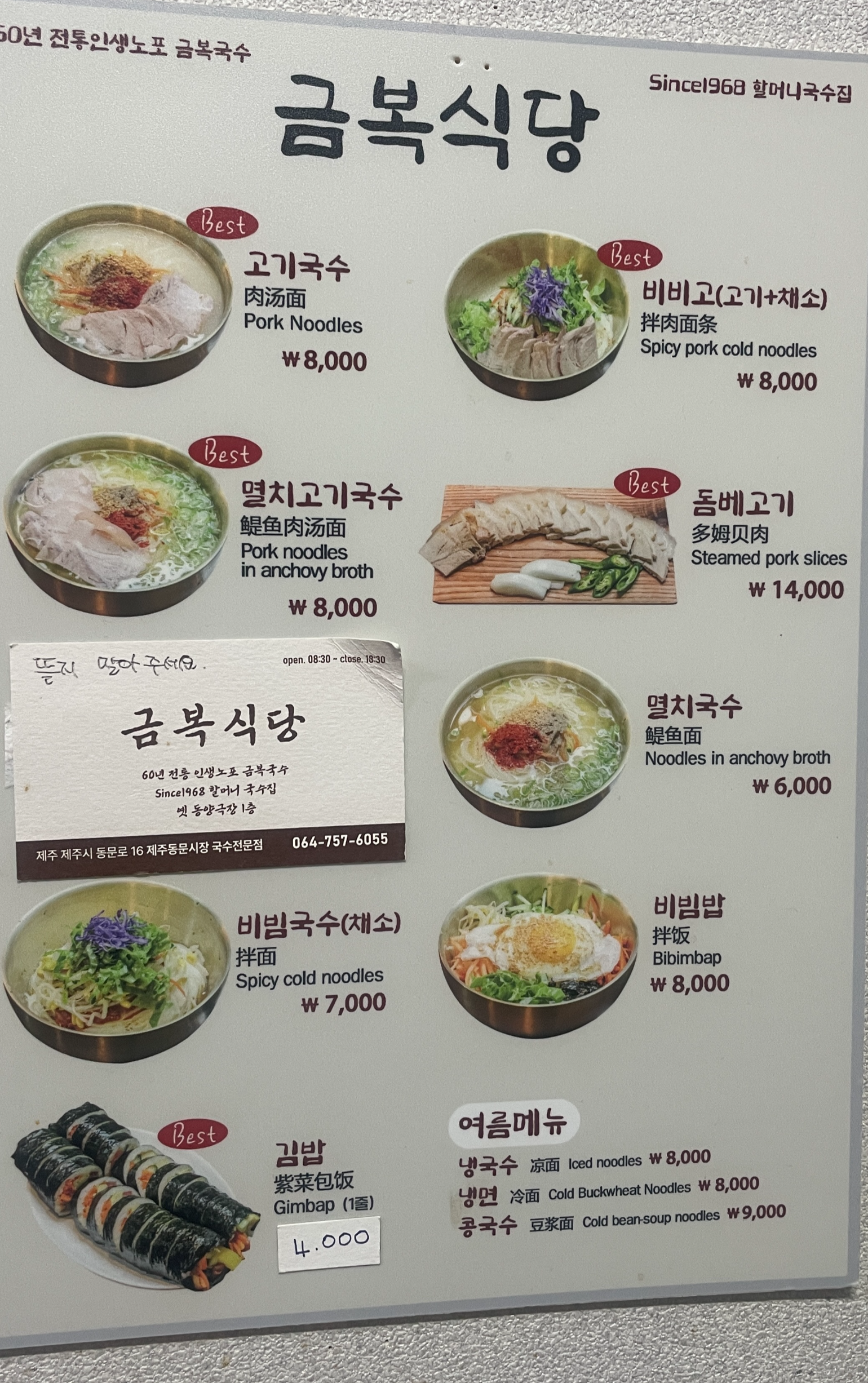 금복식당은 60년 넘게 동문시장에서 고기국수를 해온 노포집으로 고기국수 맛집으로 소문난 곳입니다. 이곳에서는 고기국수 외엥도 멸치국수, 비빔국수, 돔베고기, 김밥등을 판매하고 있습니다. 일단 고기국수는 무조건 맛보시기 바랍니다. 그리고 하나 더 추천하자면 멸치고기국수도 추천드립니다. 육수의 깊이가 남다릅니다.