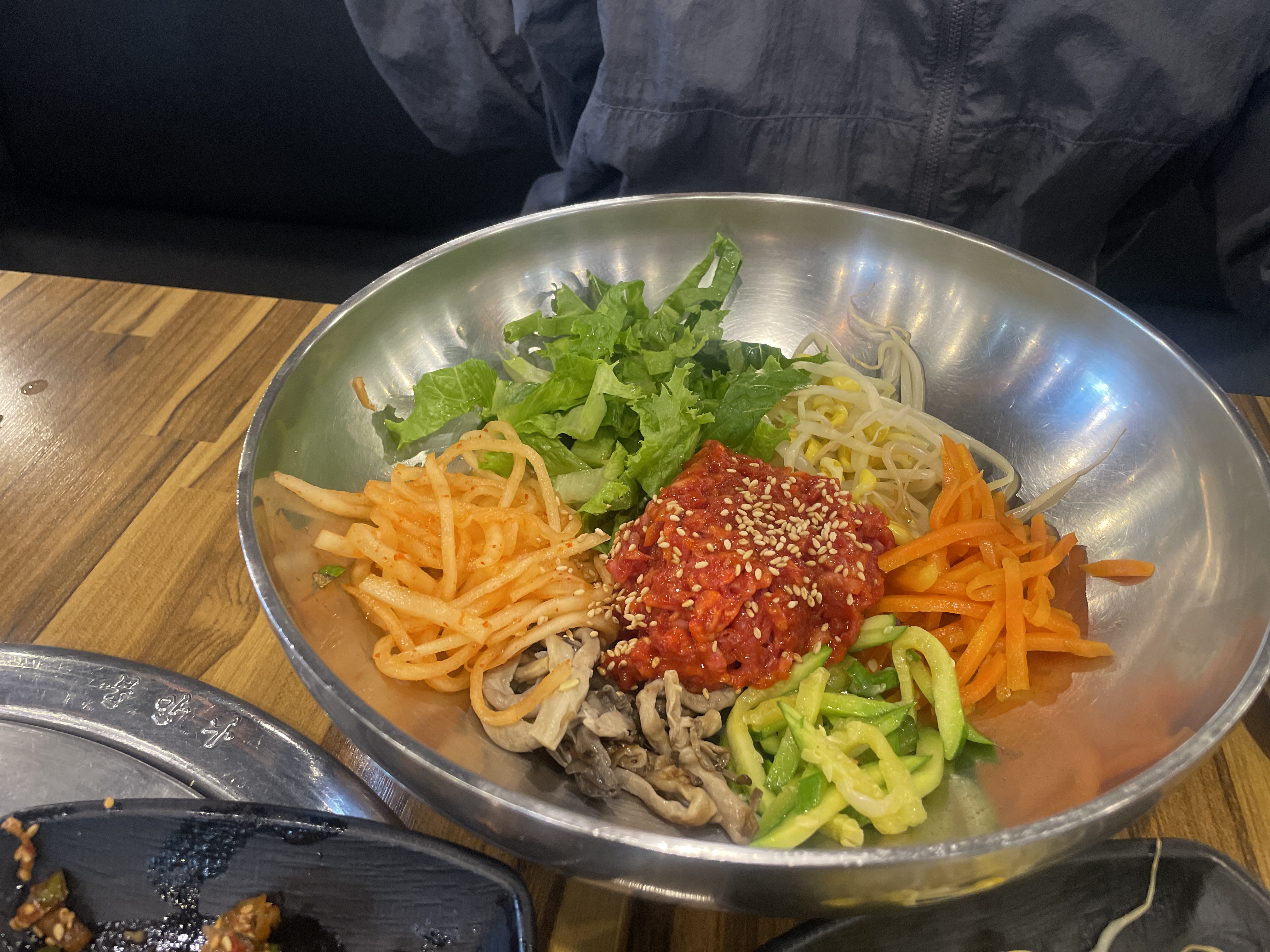 이 집에서 가장 먼저 추천하고 싶은 메뉴는 육회비빔밥입니다. 큼직한 스테인리스 그릇에 신선한 채소와 고소한 육회가 푸짐하게 담겨 나오며, 위에는 고소한 참깨가 솔솔 뿌려져 있어 식감을 더욱 살려줍니다. 밥을 쓱쓱 비비는 순간, 고기의 풍미와 야채의 상큼함이 어우러져 감탄이 절로 나옵니다.