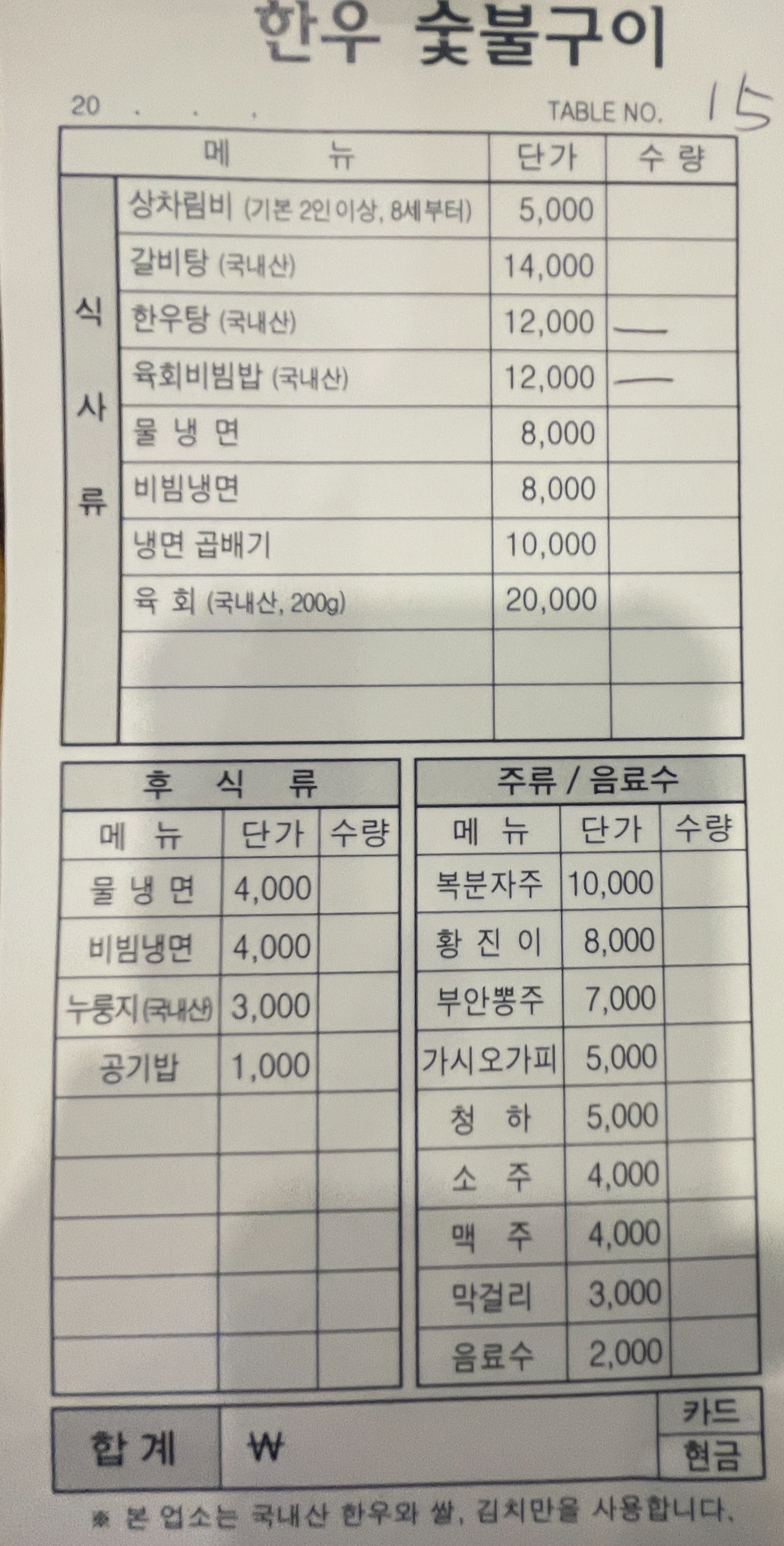 옆의 한우 직판장에서 고기를 사셔서 기본 상차림비를 내고 먹는 구조인데. 1인 5,000원... 저렴하지 않은 가격입니다.