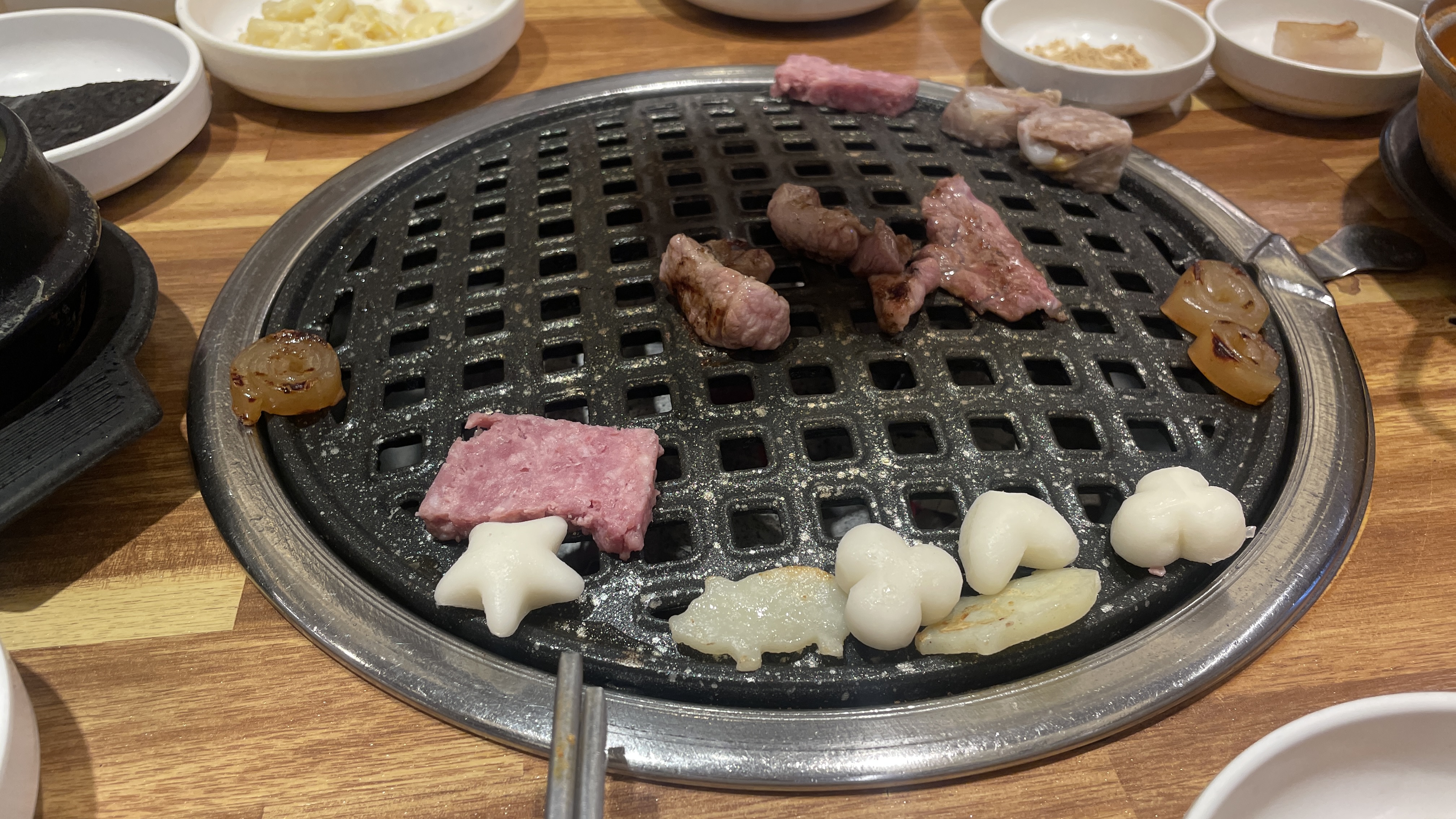 깔끔하고 정갈한 밑반찬들과 함께 제공되는 된장찌개, 계란찜, 쌈 채소들도 모두 수준급입니다. 무엇보다 감동이었던건 떡갈비, 돼지모양 감자, 별 모양 떡, 돼지 껍데기 등 서비스 등이 계속 나온다는 점!!!