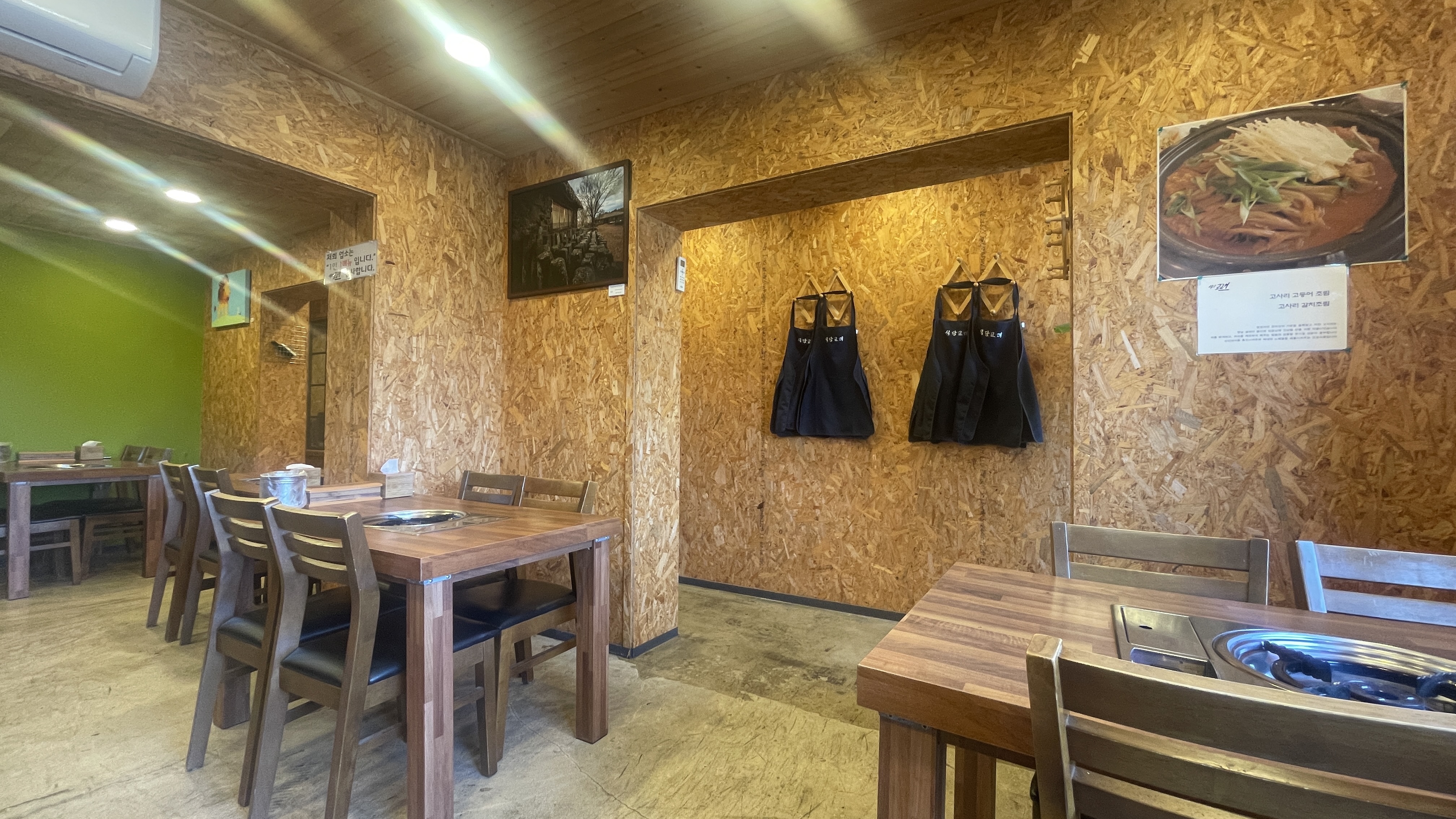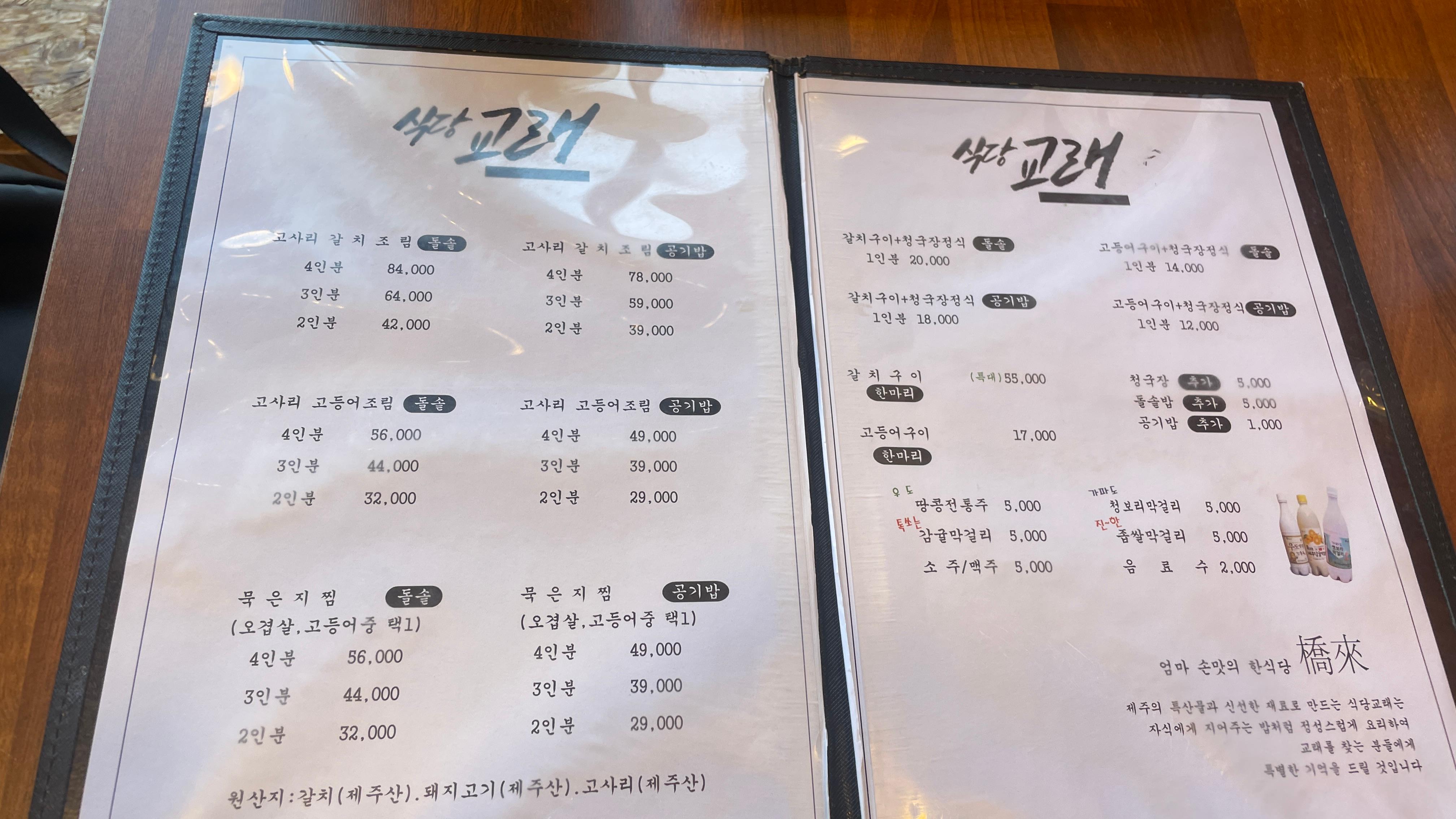 깔끔한 외관과 큼직한 간판 덕분에 쉽게 찾을 수 있습니다. '식당 교래'라는 이름처럼 소박하지만, 내부는 깔끔하고 편안한 분위기에서 식사할 수 있습니다. 벽면에는 고사리 갈치조림의 유래와 맛의 특징을 설명해주는 안내가 있어 음식에 대한 이해를 더해주더라구요.