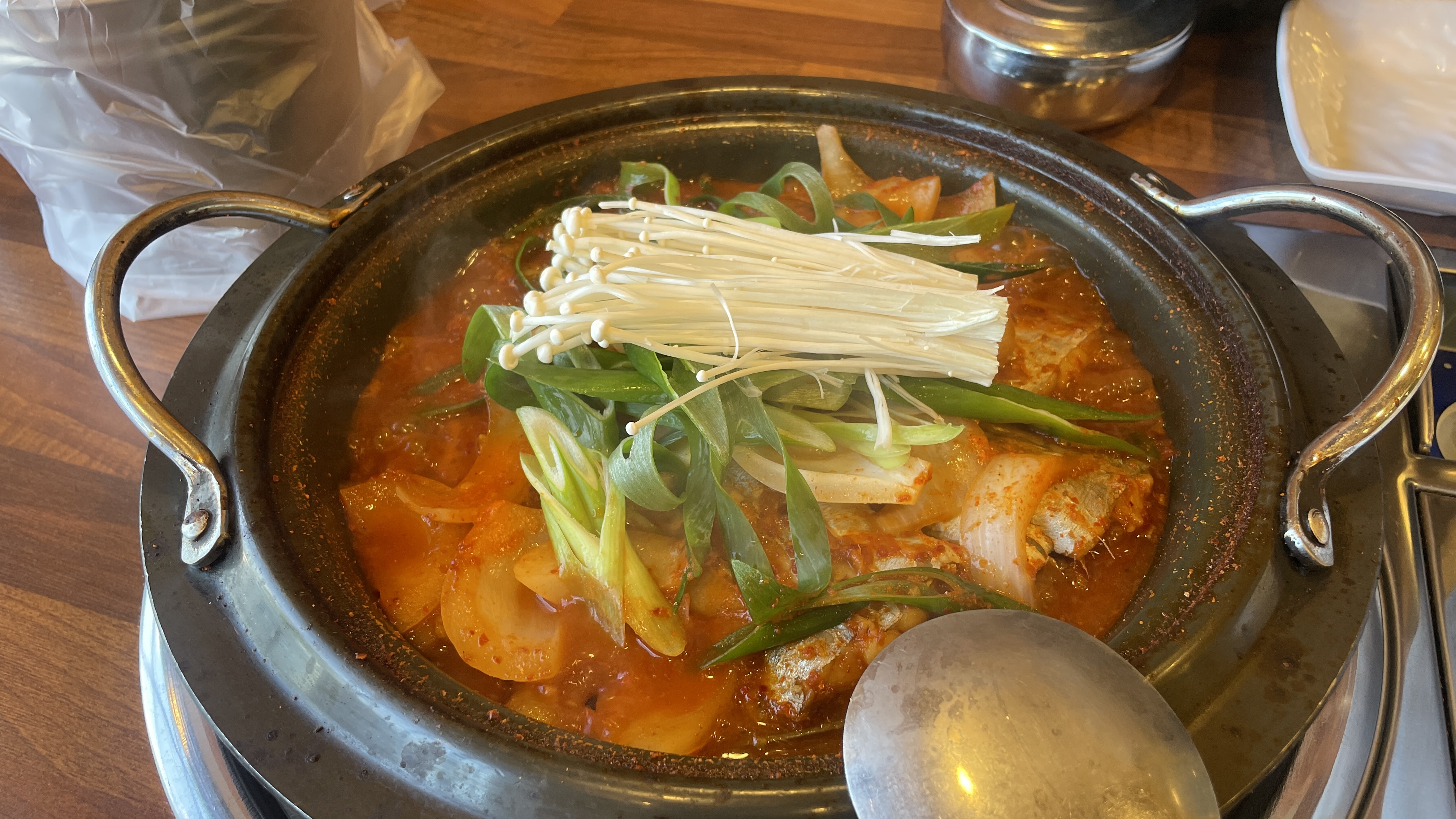 냄비에 푸짐하게 담긴 갈치와 고사리, 그리고 각종 야채들. 위에는 패이버섯과 대파가 듬뿍 올라가 있어 시각적으로도 군침을 자극합니다. 고사리에서 배어 나오는 구수한 향과 양념장의 칼칼한 맛이 조화를 이루며, 제주 바다와 산의 맛을 동시에 즐길 수 있는 특별한 조림이었습니다. 갈치 살은 부드럽고 촉촉하며, 고사리도 푹 익어 있어 입안에서 부드럽게 씹힙니다.