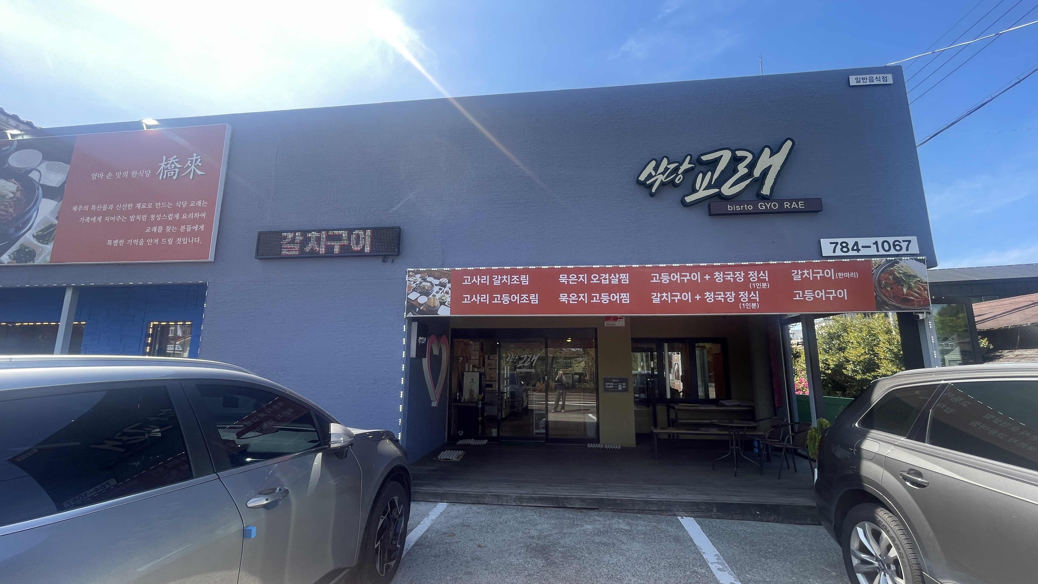 깔끔한 외관과 큼직한 간판 덕분에 쉽게 찾을 수 있습니다. '식당 교래'라는 이름처럼 소박하지만, 내부는 깔끔하고 편안한 분위기에서 식사할 수 있습니다. 벽면에는 고사리 갈치조림의 유래와 맛의 특징을 설명해주는 안내가 있어 음식에 대한 이해를 더해주더라구요.