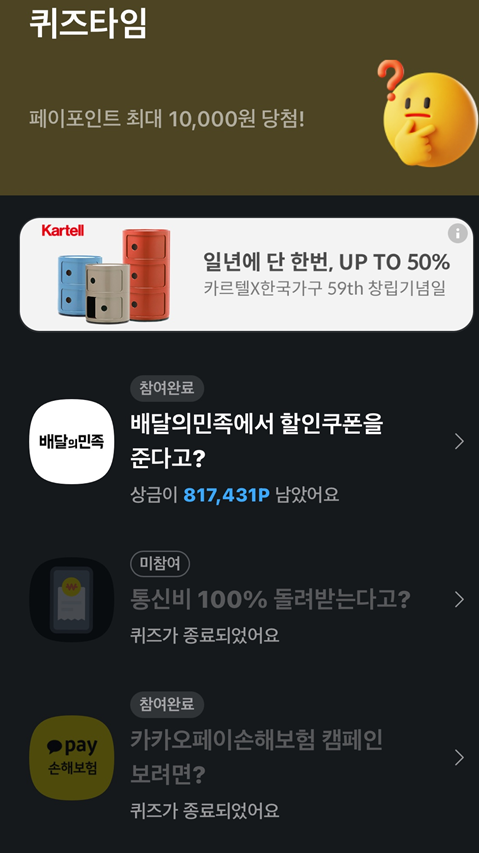 - 카카오톡 앱에서 '카카오페이' 서비스를 선택하거나, 퀴즈 관련 알림 메시지를 통해 접근할 수 있습니다.
