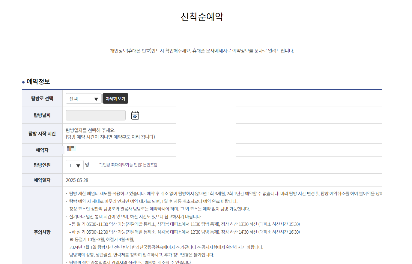 - 무단 입산 또는 예약 미확인 시 입장 불가