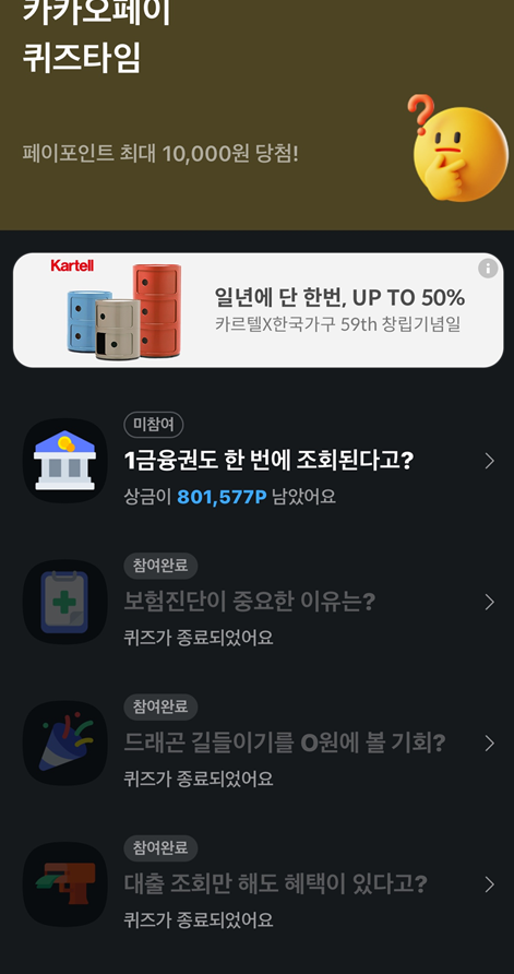 - 카카오톡 앱에서 '카카오페이' 서비스를 선택하거나, 퀴즈 관련 알림 메시지를 통해 접근할 수 있습니다.