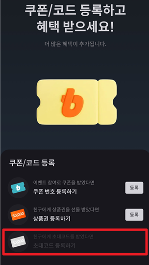 초대코드 입력 경로: 더보기 → 쿠폰/ 코드 등록 → 초대코드 등록