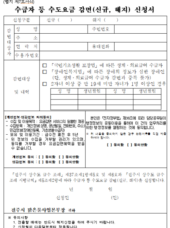 • 신청서류: 신분증, 수도요금 고지서 지참, 수도요금 감면 신청서(동사무소에 구비되어있음)