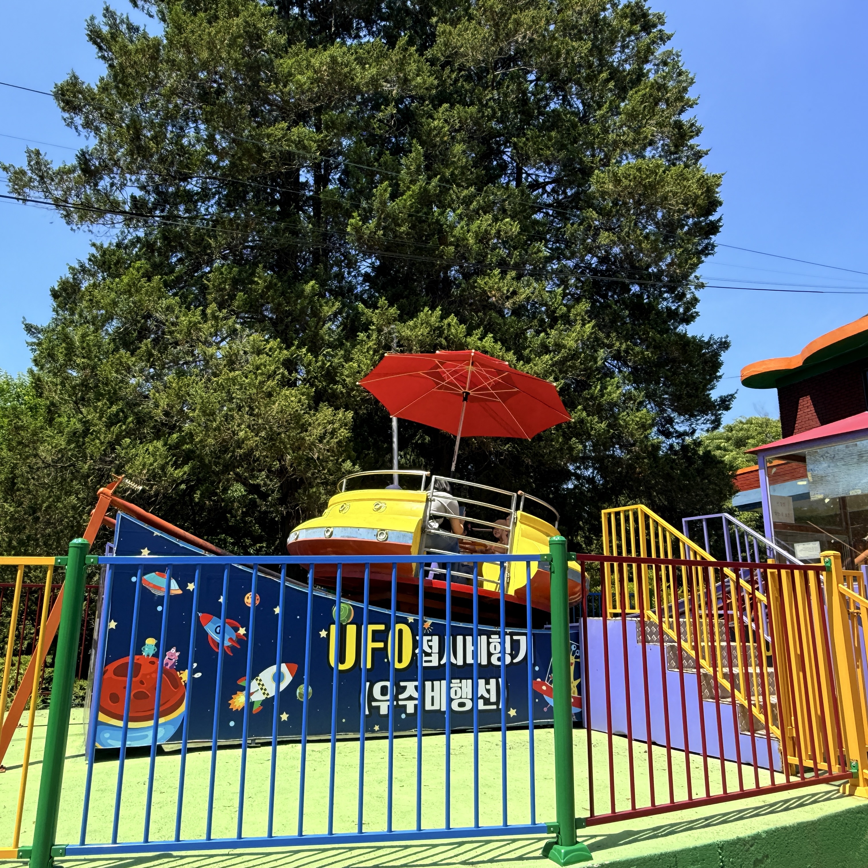 '우주비행선', '회전오리'와 같은 놀이기구는 유아동을 위한 귀엽고 아기자기한 기구들입니다. 부모들이 옆에서 지켜보며 사진 찍기 딱 좋은 코스들이죠. 알록달록한 우산이 설치되어 있어 햇볕 걱정도 덜할 수 있어요.