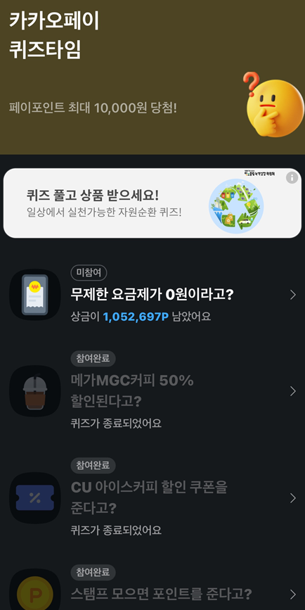 - 카카오톡 앱에서 '카카오페이' 서비스를 선택하거나, 퀴즈 관련 알림 메시지를 통해 접근할 수 있습니다.