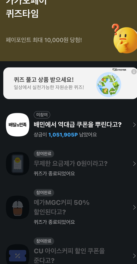 - 카카오톡 앱에서 '카카오페이' 서비스를 선택하거나, 퀴즈 관련 알림 메시지를 통해 접근할 수 있습니다.