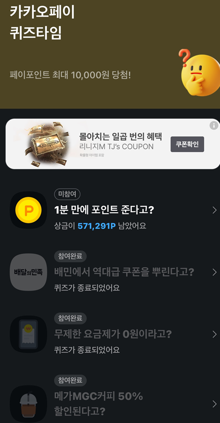 - 카카오톡 앱에서 '카카오페이' 서비스를 선택하거나, 퀴즈 관련 알림 메시지를 통해 접근할 수 있습니다.