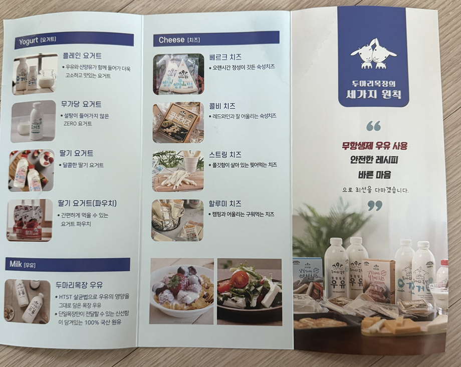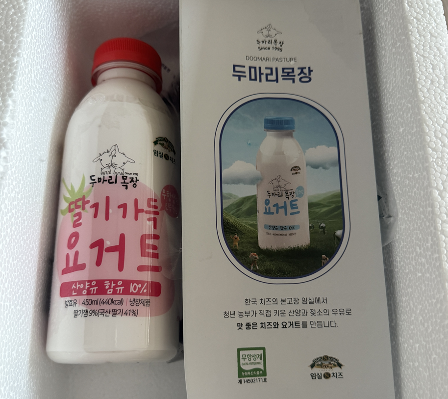 두꺼운 스티로폼안에 요거트와 아이스팩이 함께 담겨 배송이 완료된 후 시간이 지난뒤에도 요거트의 시원함이 유지되었습니다. 요거트와 함께 두마리목장에서 판매중인 다양한 유제품들을 소개하는 팜플렛이 있더라구요. 제가 좋아하는 요거트와 치즈들이 있던데 모두 맛봐야 겠어요.