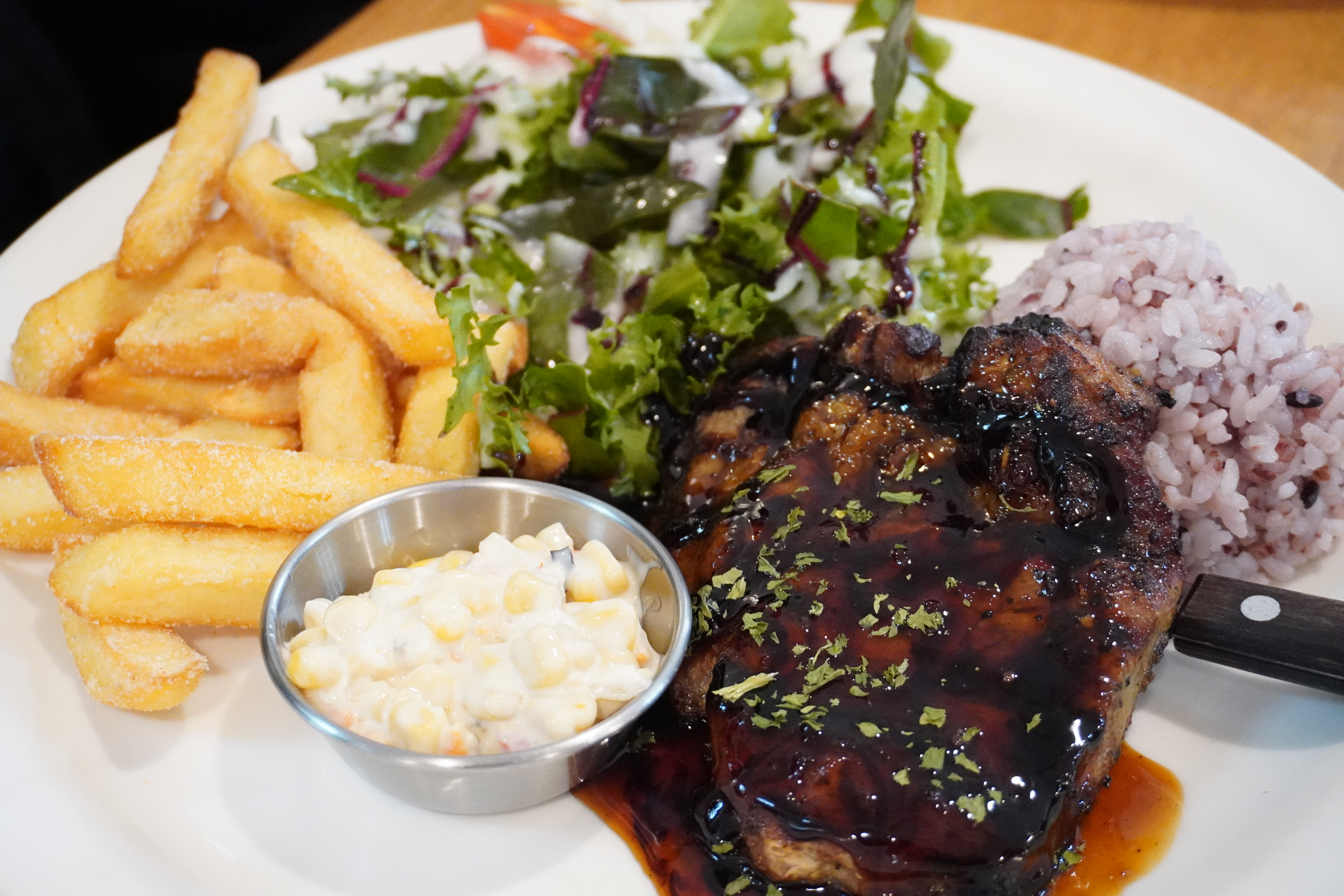 먼저 아이들이 하나도 남김없이 맛있게 먹은 포크스테이크 입니다. 스테이크는 별 기대를 하지 않앗는데 너무 맛있더라구요. 호불호 없이 먹을 수 있는 메뉴였어요.