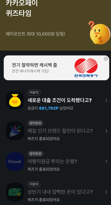 - 카카오톡 앱에서 '카카오페이' 서비스를 선택하거나, 퀴즈 관련 알림 메시지를 통해 접근할 수 있습니다.