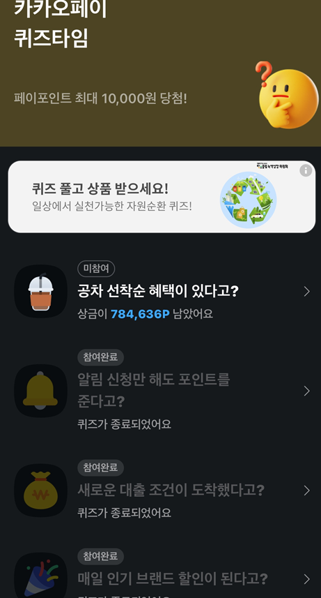 - 카카오톡 앱에서 '카카오페이' 서비스를 선택하거나, 퀴즈 관련 알림 메시지를 통해 접근할 수 있습니다.