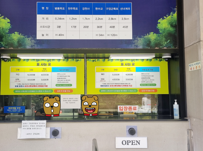 강천산 국립공원 매표소 입니다. 이곳에서 강천사 각 코스의 거리와 소요시간이 안내되어 있네요. 맨발산책코스는 구장군폭포까지 가는 코스입니다. 입장권을 구입하면 2,000원 순창사랑상품권을 주니 실제 입장권은 3,000원이라 생각하시면 됩니다. 받은 상품권은 순창 어디에서나 사용가능합니다.