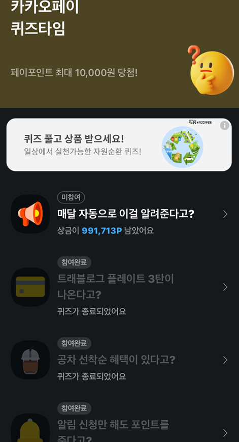 - 카카오톡 앱에서 '카카오페이' 서비스를 선택하거나, 퀴즈 관련 알림 메시지를 통해 접근할 수 있습니다.