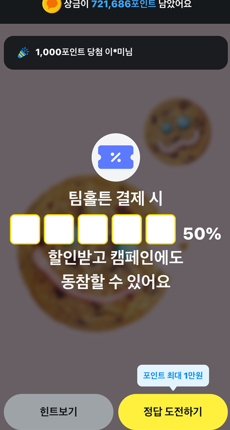 팀홀튼 결제 시 스마일쿠키 50% 할인받고캠페인에도 동참할 수 있어요
