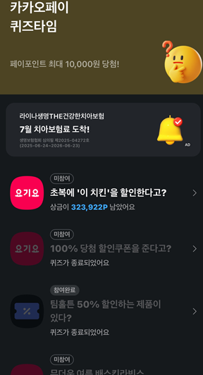 • 카카오톡 앱에서 '카카오페이' 서비스를 선택하거나, 퀴즈 관련 알림 메시지를 통해 접근할 수 있습니다.