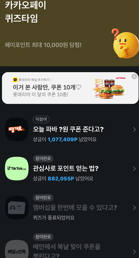 - 카카오톡 앱에서 '카카오페이' 서비스를 선택하거나, 퀴즈 관련 알림 메시지를 통해 접근할 수 있습니다.