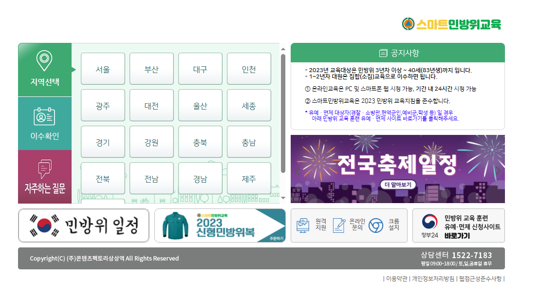 혹시나 뒤늦게 통지서를 확인하셔서 자신의 거주지의 훈련을 놓치셨거나, 등본상 거주지가 아닌 다른 곳에서 훈련을 받고 싶다면 해당 지역의 훈련일정을 확인하여 참석하시면 됩니다.