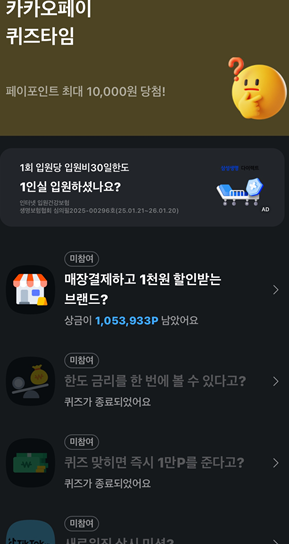 • 카카오톡 앱에서 '카카오페이' 서비스를 선택하거나, 퀴즈 관련 알림 메시지를 통해 접근할 수 있습니다.