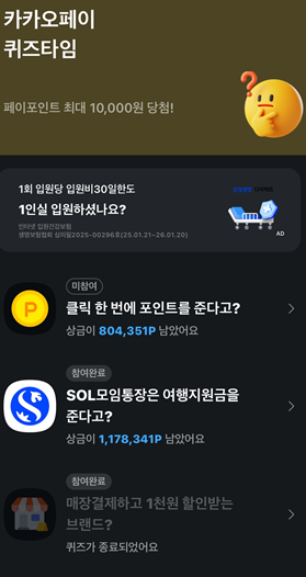 • 카카오톡 앱에서 '카카오페이' 서비스를 선택하거나, 퀴즈 관련 알림 메시지를 통해 접근할 수 있습니다.