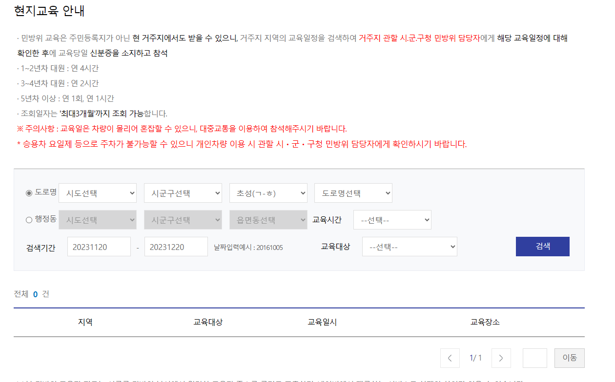 아래와 같은 화면에서 자신이 교육받고 싶은 지역을 검색하면 훈련 일정이 나옵니다. 잘 확인하시고 관할 시.군.구청 민방위 담당자에게 해당 교육일정에 대해 확인한 후 참석하시면 됩니다.