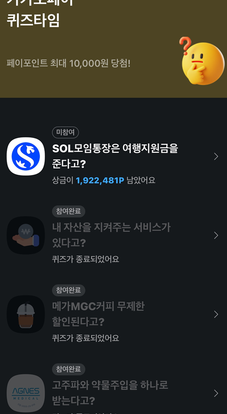 - 카카오톡 앱에서 '카카오페이' 서비스를 선택하거나, 퀴즈 관련 알림 메시지를 통해 접근할 수 있습니다.