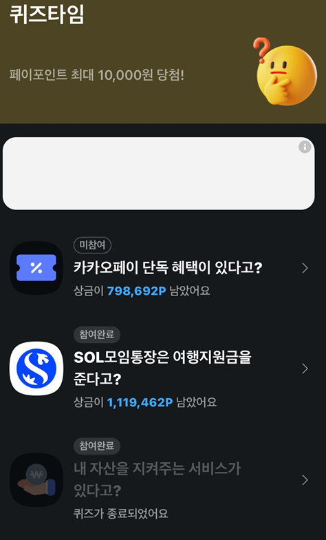 - 카카오톡 앱에서 '카카오페이' 서비스를 선택하거나, 퀴즈 관련 알림 메시지를 통해 접근할 수 있습니다.
