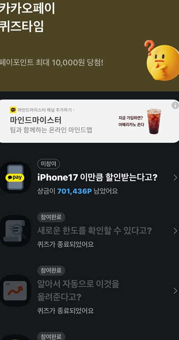 - 카카오톡 앱에서 '카카오페이' 서비스를 선택하거나, 퀴즈 관련 알림 메시지를 통해 접근할 수 있습니다.