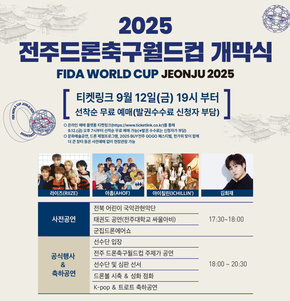 오는 2025년 9월 25일(목)부터 9월 28일(일)까지, 드론축구 종주도시 전주에서 열리는 FIDA WORLD CUP JEONJU 2025가 여러분을 기다리고 있습니다. 특히 개막식은 티켓링크에서 무료로 선착순 예매이니 늦지 않도록 서두르시기 바랍니다.!!