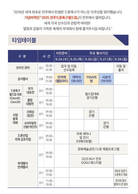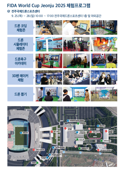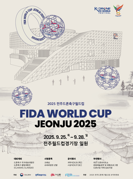 오는 2025년 9월 25일(목)부터 9월 28일(일)까지, 드론축구 종주도시 전주에서 열리는 FIDA WORLD CUP JEONJU 2025가 여러분을 기다리고 있습니다. 특히 개막식은 티켓링크에서 무료로 선착순 예매이니 늦지 않도록 서두르시기 바랍니다.!!