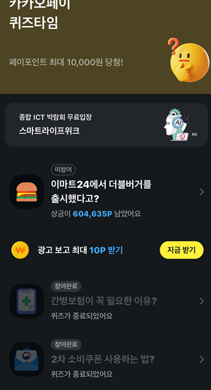 - 카카오톡 앱에서 '카카오페이' 서비스를 선택하거나, 퀴즈 관련 알림 메시지를 통해 접근할 수 있습니다.